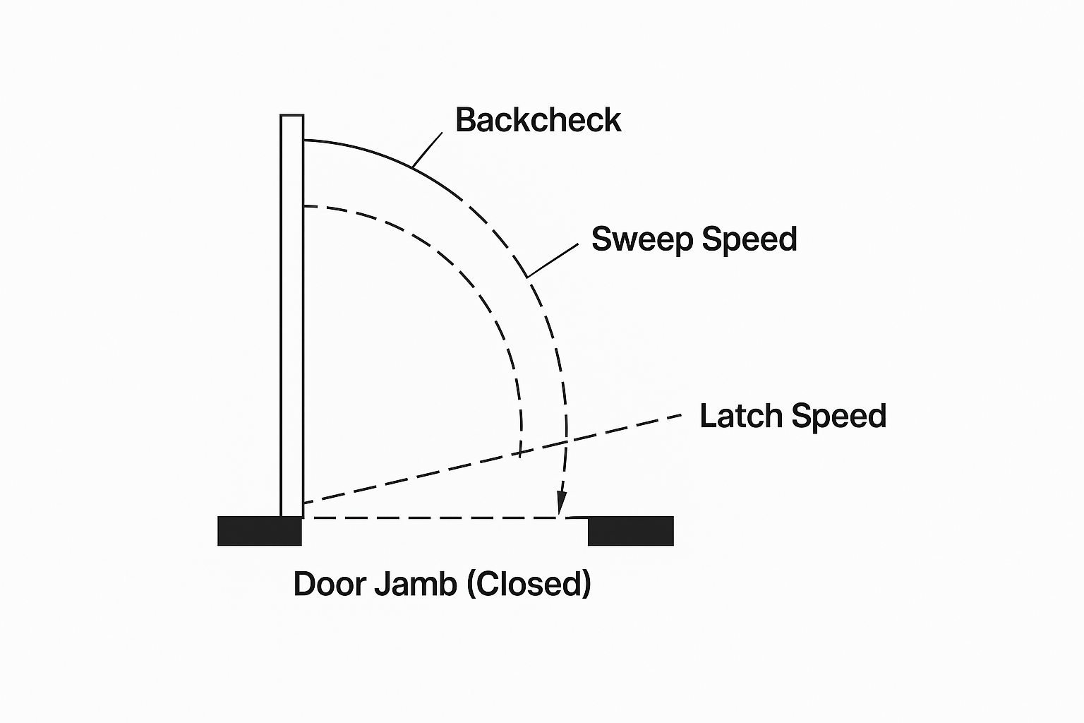 In a traditional door closer, the backcheck function limits the door’s swing when opened too forcefully, engaging at around 70-90 degrees to slow its motion and prevent damage to walls, furniture, or people. This feature helps protect both the door and its surroundings, especially in high-traffic or commercial settings.
