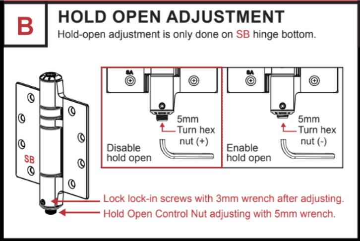 - Using a 5mm hex wrench, rotate the hold-open control nut from the (-) to the (+) direction.